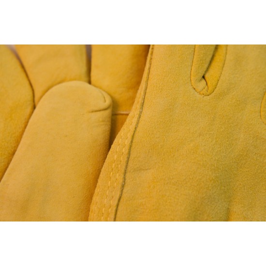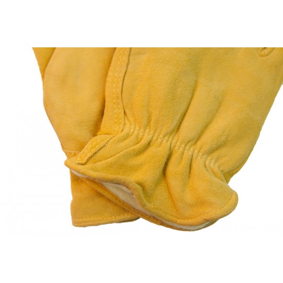 Tan deerskin suede, Shirred elastic wrist, Keystone thumb, C100 Thinsulate lining, Leather cuff